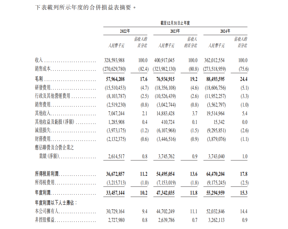 根据招股书显示,宁德时代的盈利能力持续提升,年度利润持续增长。2022~2024年,该公司营收分别为3286亿元、4009亿元、3620亿元,年度利润分别为335亿元、473亿元及553亿元。